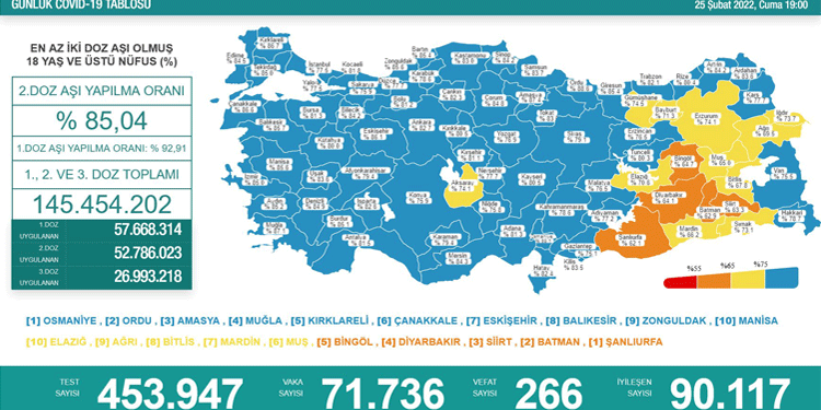 Sağlık Bakanlığı’nın günlük açıkladığı koronavirüs verilere göre son 24 saatte 453 bin 947 test yapıldı ve 71 bin 736 yeni vaka tespit edildi. 266 kişinin koronavirüs sebebiyle hayatını kaybettiği belirtildi.