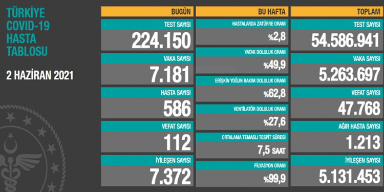 Sağlık Bakanlığı, koronavirüs (Covid-19) günlük hasta tablosunu paylaştı. Verilere göre, Türkiye’de koronavirüs nedeniyle son 24 saatte 112 kişi daha hayatını kaybetti, 586 yeni hasta dahil olmak üzere 7181 yeni vaka tespit edildi.