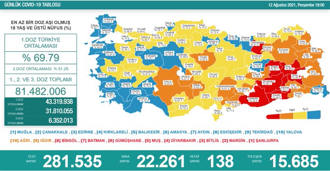 Sağlık Bakanlığı’nın günlük açıkladığı koronavirüs verilere göre son 24 saatte 281 bin 535 test yapıldı ve 22 bin 261 yeni vaka tespit edildi. 138 kişinin koronavirüs sebebiyle hayatını kaybettiği belirtildi.