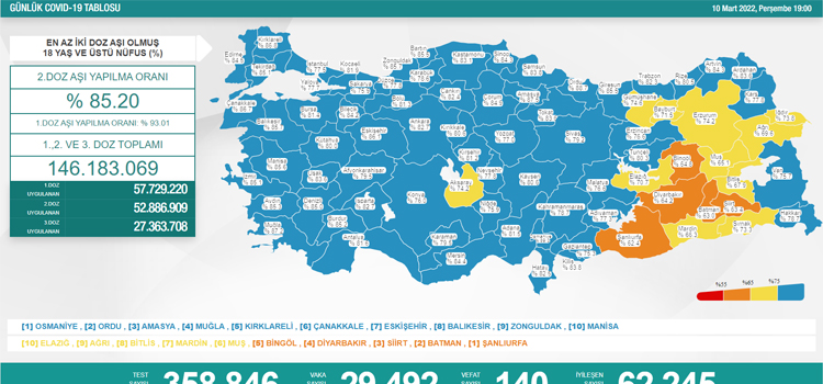 Sağlık Bakanlığı’nın günlük açıkladığı koronavirüs verilere göre son 24 saatte 358 bin 846 Kovid-19 testi yapıldı, 29 bin 492 yeni vaka tespit edildi. 140 kişinin de koronavirüs sebebiyle hayatını kaybettiği belirtildi.
