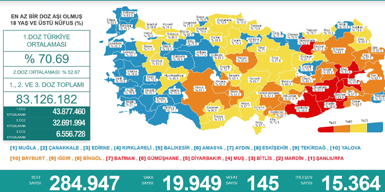 Sağlık Bakanlığı’nın günlük açıkladığı koronavirüs verilere göre son 24 saatte 19 bin 949 yeni vaka tespit edildi. 145 kişinin koronavirüs sebebiyle hayatını kaybettiği belirtildi. Bugün 284 bin 947 test yapıldı.