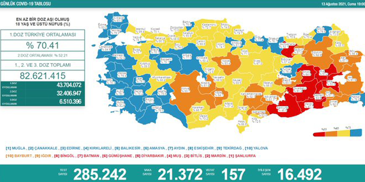 Sağlık Bakanlığı’nın günlük açıkladığı koronavirüs verilere göre son 24 saatte 285 bin 242 test yapıldı ve 21 bin 372 yeni vaka tespit edildi. 157 kişinin koronavirüs sebebiyle hayatını kaybettiği belirtildi.