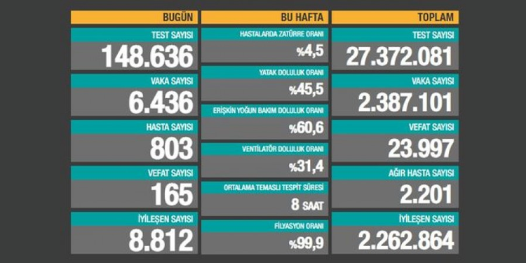 Tabloya göre Türkiye’de Koronavirüs nedeniyle 165 kişi daha hayatını kaybetti, 6 bin 436 yeni vaka tespit edildi. Böylece pandemiden dolayı yaşamını yitiren toplam kişi sayısı 23 bin 997’ye, vaka sayısı ise 2 milyon 387 bin 101’e yükseldi.
