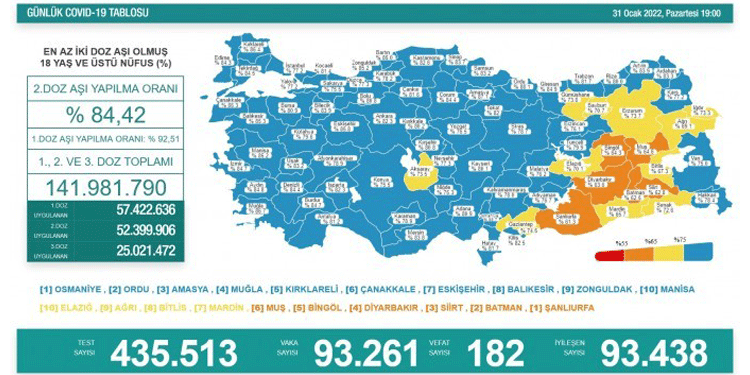 Sağlık Bakanlığı’nın günlük açıkladığı koronavirüs verilere göre son 24 saatte 435 bin 513 test yapıldı ve 93 bin 261 yeni vaka tespit edildi. 182 kişinin koronavirüs sebebiyle hayatını kaybettiği belirtildi.