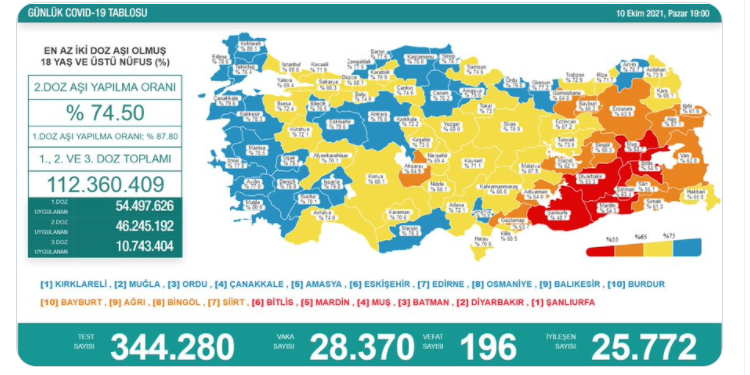 Sağlık Bakanlığı’nın günlük açıkladığı koronavirüs verilere göre son 24 saatte 344 bin 280 test yapıldı ve 28 bin 370 yeni vaka tespit edildi. 196 kişinin koronavirüs sebebiyle hayatını kaybettiği belirtildi.