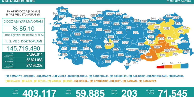 Sağlık Bakanlığı’nın günlük açıkladığı koronavirüs verilere göre son 24 saatte 403 bin 117 test yapıldı ve 59 bin 885 yeni vaka tespit edildi. 203 kişinin koronavirüs sebebiyle hayatını kaybettiği belirtildi.