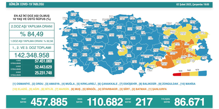 Sağlık Bakanlığı’nın günlük açıkladığı koronavirüs verilere göre son 24 saatte 457 bin 885 test yapıldı ve 110 bin 682 yeni vaka tespit edildi. 217 kişinin koronavirüs sebebiyle hayatını kaybettiği belirtildi.