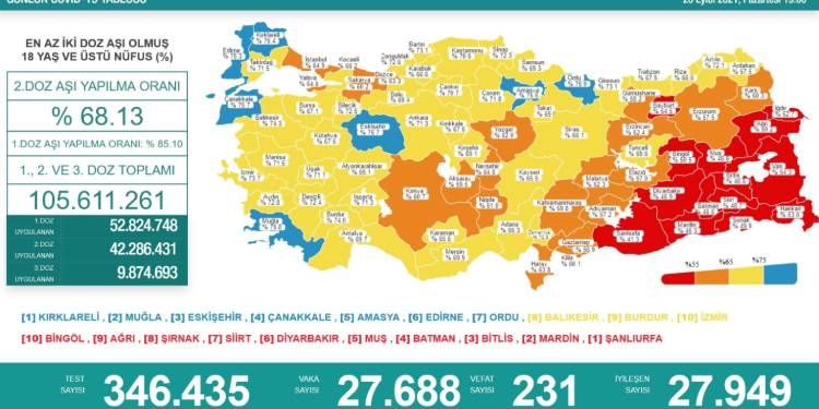 Sağlık Bakanı Fahrettin Koca yaptığı açıklamada, “GÜNLÜK COVİD-19 TABLOMUZ DEĞİŞTİ. Bugünden itibaren, il bazında, ilk doz yerine, en az iki doz aşı olanların oranlarını paylaşacağız. Aşılarımızı yaptırarak vaka sayılarını düşürelim, can kayıplarımızı azaltalım. İlk doz aşıda önemli bir mesafe kaydettik” ifadelerini kullandı.