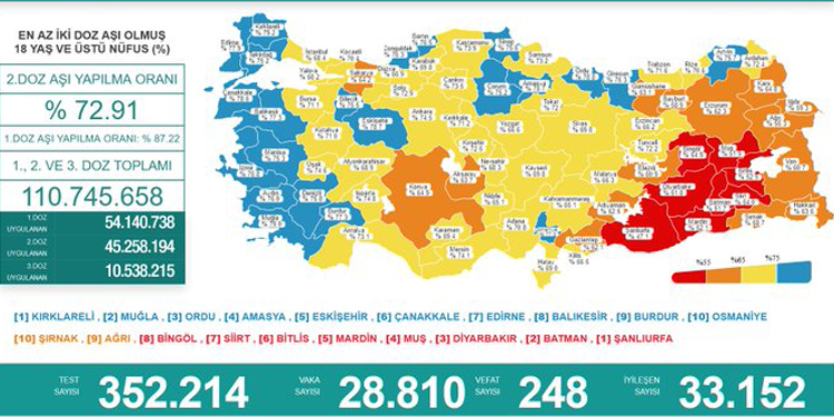 Sağlık Bakanlığı’nın günlük açıkladığı koronavirüs verilere göre son 24 saatte 352 bin 214 test yapıldı ve 28 bin 810 yeni vaka tespit edildi. 248 kişinin koronavirüs sebebiyle hayatını kaybettiği belirtildi.