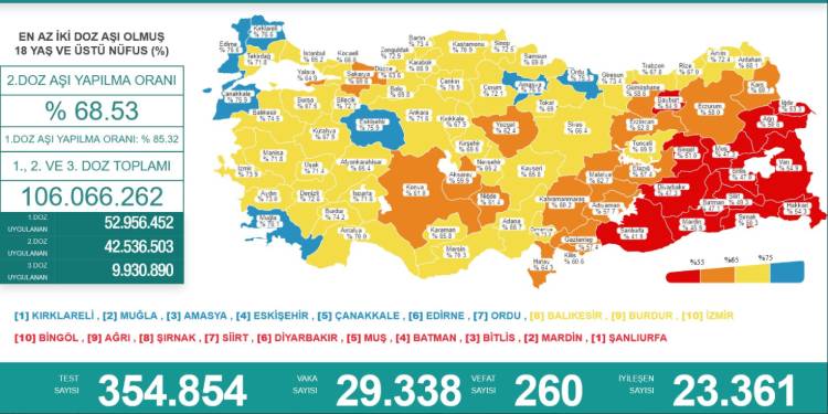 Sağlık Bakanı Fahrettin Koca, günlük Koronavirüs tablosunu şu notla duyurdu: “Bugünkü vaka sayısı 29.338. Yeni can kaybımız 260. Vaka sayılarında 20.000’i kritik eşik kabul ederken, şimdi neredeyse 30.000’e yaklaşmış durumdayız. Sosyal ortamlarda çok dikkatli olun. Maskenizi kullanın. Yaptırmadığınız aşılarınızı mutlaka yaptırın. Kritik bir dönemdeyiz.”