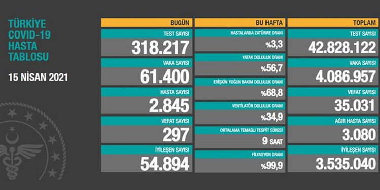 Sağlık Bakanlığı, koronavirüs (Kovid-19) günlük hasta tablosunu paylaştı. Verilere göre, Türkiye’de koronavirüs nedeniyle son 24 saatte 297 kişi daha hayatını kaybetti, 2 bin 845 yeni hasta dahil olmak üzere 61 bin 400 yeni vaka tespit edildi.
