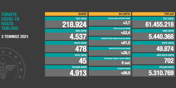 Sağlık Bakanlığı, koronavirüs (Kovid-19) günlük hasta tablosunu paylaştı. Verilere göre, Türkiye’de koronavirüs nedeniyle son 24 saatte 45 kişi daha hayatını kaybetti, 478 yeni hasta dahil olmak üzere 4 bin 537 yeni vaka tespit edildi.