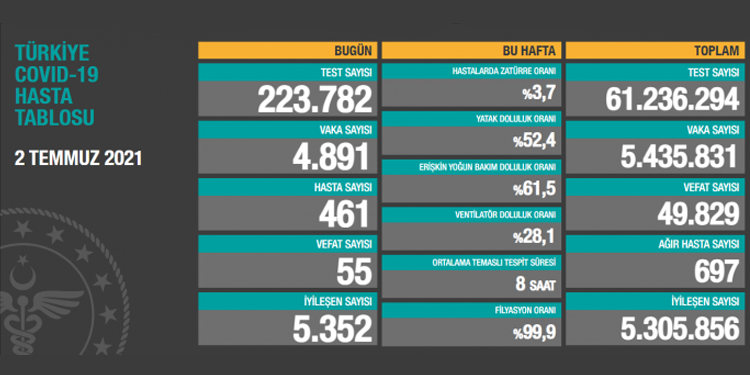 Sağlık Bakanlığı, koronavirüs (Kovid-19) günlük hasta tablosunu paylaştı. Verilere göre, Türkiye’de koronavirüs nedeniyle son 24 saatte 55 kişi daha hayatını kaybetti, 461 yeni hasta dahil olmak üzere 4 bin 891 yeni vaka tespit edildi.