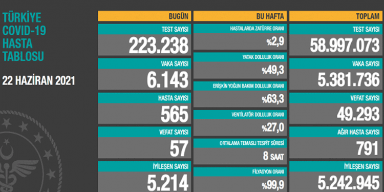 Sağlık Bakanlığı, koronavirüs (Covid-19) günlük hasta tablosunu paylaştı. Verilere göre, Türkiye’de koronavirüs nedeniyle son 24 saatte 57 kişi daha hayatını kaybetti, 565 yeni hasta dahil olmak üzere 6143 yeni vaka tespit edildi.