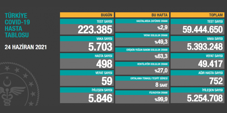 Sağlık Bakanlığı, koronavirüs (Kovid-19) günlük hasta tablosunu paylaştı. Verilere göre, Türkiye’de koronavirüs nedeniyle son 24 saatte 59 kişi daha hayatını kaybetti, 498 yeni hasta dahil olmak üzere 5 bin 703 yeni vaka tespit edildi.