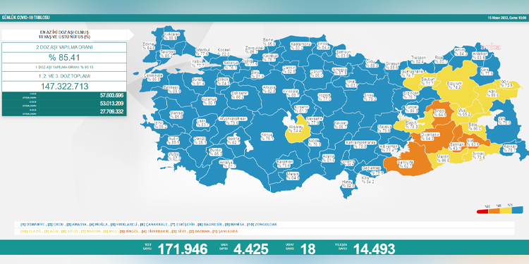Sağlık Bakanlığı’nın paylaştığı haritada, 2. doz aşılamada hedef nüfusun yüzde 75 ve üzerinin aşılandığı iller mavi renkle gösteriliyor. Sağlık Bakanlığı’nın koronavirüs verilerine ilişkin yayınladığı tabloda yer alan bilgilere göre; 2. doz aşılamada yüzde 89.4 aşılama oranıyla Osmaniye birinci sırada yer alıyor. Yüzde 62.7 aşılama oranı ile Şanlıurfa ise son sırada bulunuyor. 2. doz aşılamada üç büyük ilde ise birinci sırada yüzde 85.2 ile İzmir, ikinci sırada yüzde 82.8 ile Ankara ve üçüncü sırada yüzde 77.6 ile İstanbul yer alıyor.