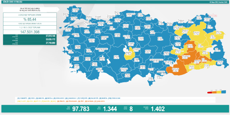 Sağlık Bakanlığı’nın 2 Mayıs’a ilişkin koronavirüs verilerine göre; son 24 saat içerisinde yapılan 97 bin 783 testten 1344’ü pozitif çıktı. Virüs nedeniyle 8 kişi daha hayatını kaybetti. İyileşen hasta sayısı 1402 olarak açıklandı.