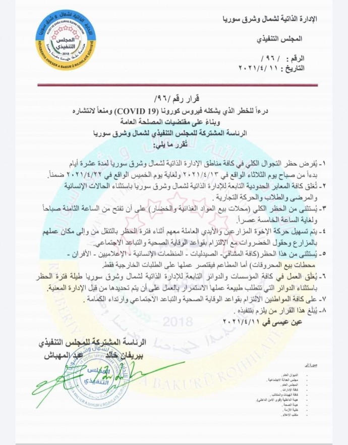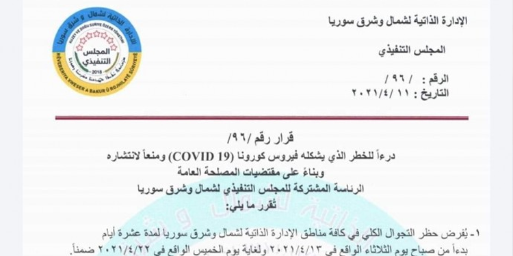 “- Kuzey ve Doğu Suriye’nin tamamında 13 Nisan 2021 Salı gününden 22 Nisan 2021 Perşembe gününe kadar 10 boyunca sokağa çıkma yasağı ilan edilmiştir.