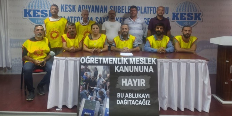 Eğitim ve Bilim Emekçileri Sendikası (Eğitim-Sen) Adıyaman Şubesi, geçen gün Eğitim-Sen Genel Merkez yöneticileri ve üyelerinin meslek kanununa dair Ankara’da Milli Eğitim Bakanlığı (MEB) Binası önünde yapmak istedikleri basın açıklamasının engellenmesi ve yaşanan polis saldırısına dair basın toplantısı düzenledi. Şube binalarında gerçekleşen açıklamaya çok sayıda eğitim emekçisi katılırken, toplantının yapıldığı salona “Öğretmenlik meslek kanununa hayır bu ablukayı dağıtacağız” pankartı asıldı.