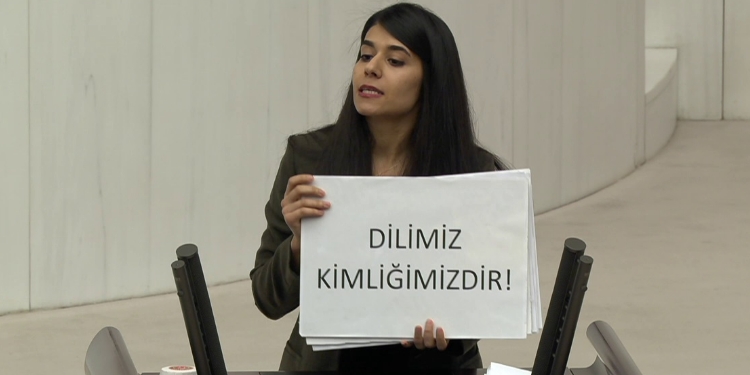 Güneş, daha sonra ise TDK’nin “Bizim dilimiz kimliğimiz” sözlerine işaret ederek, Kürtçe ile “Dilimiz, kimliğimizdir, dilimiz onurumuzdur. Dilimiz tarihimizdir. Dilimiz kültürümüz. Her daim sahip çıkacağız” dedi. Güneş, bu sırada Kürtçe söylediği sözlerin Türkçe karşılığını da Meclis kürsüsünde dövizler kaldırarak gösterdi.