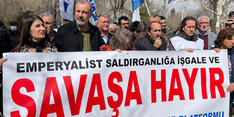 KESK Eş Genel Başkanı Bozgeyik ise, Avrupa’da Ortadoğu’da seslerini yükselten kadınlarla, gençlerle dayanışmayı büyütme zorunluluğu içerisinde olduklarını belirterek, “Hem ABD’nin, hem NATO’nun hem de Rusya’nın dünyadaki bu emperyalist paylaşım savaşlarının, hegemonya savaşlarının durdurulması ve dünyada yeniden barışın egemen olması için üzerimize büyük sorumluluk düşüyor. Bu savaştan en fazla işçiler, kamu emekçileri, kadınlar, çocuklar yani emeğiyle geçinen hepimiz, savaşın yoksulluğunu çekiyoruz” dedi.