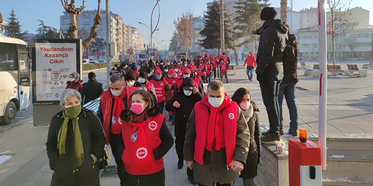 Ardından DİSK Genel Başkanı Arzu Çerkezoğlu öncülüğünde, yüzlerce işçi “Açlıktan ölmeyiz, yolumuzdan dönmeyiz”, “Ölüm olsa sonumuz, Ankara’dır yolumuz” sloganları eşliğinde eksi 10 derece soğuğa rağmen Organize Sanayi Bölgesindeki fabrikaya doğru 17 kilometre yürüyüş gerçekleştirdi. Yürüyüşe Emek Partisi Genel Başkanı Yardımcısı Selma Gürkan da katıldı. İşçiler ardından otobüslerle Ankara’ya doğru yola çıktı.