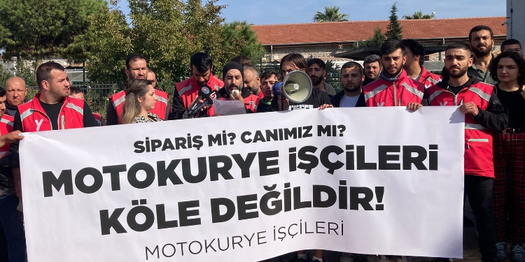 İzmir’de bulunan motokuryeler, baskılar nedeniyle yaşanan ölümlere dikkat çekmek amacıyla Alsancak Gar önünde açıklama yaptı. Buca ilçesinde 21 Ekim’de sipariş götürdükten sonra takip edilerek katledilen motokurye Okan Çakmak (22) ölümüne dikkat çekmek amacıyla “Sipariş mi? Canımız mı? Motokurye işçileri köle değildir” yazılı pankart taşıyan emekçiler, “İş kazası değil cinayet” ve “Kuryeler ölmek istemiyor” sloganları attı.