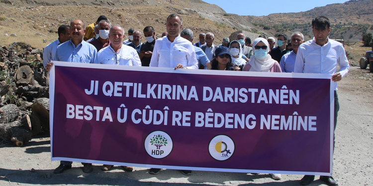 Şırnak kırsalındaki Besta ve Namaz Dağı bölgelerinde asker gözetiminde yaşanan ağaç kıyımı sürüyor. Korucular tarafından her gün tonlarca ağacın kesilmesi tepkiyle karşılanıyor. Halkların Demokratik Partisi (HDP) Şırnak İl Örgütü de bugün ağaç kıyımının sürdüğü Namaz Dağı eteklerinde bulunan Kenîsarke’de açıklama yaptı. HDP Şırnak Milletvekili Hasan Özgüneş, Özgür Kadın Hareketi (TJA) üyeleri ve çok sayıda partilinin katıldığı açıklamada “Besta ve Cudi’deki ağaç katliamına karşı sessiz kalmayın” pankartı açıldı.