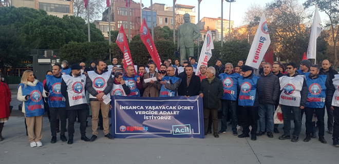 Bu soygunu kabul etmiyoruz. İnsanca koşullarda çalışarak, insanlık onuruna yaraşır ücretler alarak, adil bir vergilendirme çerçevesinde vergi ödemek istiyoruz. Dünyada ‘Başöğretmen’ unvanlı bir liderin kurduğu tek ülke olan Türkiye Cumhuriyeti’nde eğitim emekçilerinin aldığı sefalet ücretini kabul etmiyoruz. Eğitim emekçisinin evine boynu bükük, sınıfına düşünceli girdiği bir sistemde eğitimden de gelecekten de bahsedilemeyeceğinin altını çiziyoruz. Tüm kamu çalışanları için vergi diliminin yüzde 15’te sabitlenmesi gerektiğini, aksinin vergi adaletsizliğini daha da büyüteceğini vurguluyoruz.