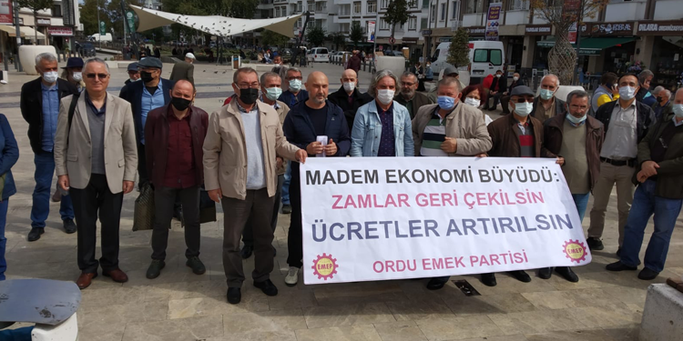 Emek Partisi (EMEP) Ordu İl Örgütü, zamları ve hayat pahalılığını protesto etti. Altınordu ilçesi Ceren Özdemir Meydanı’nda yapılan açıklamada, “Madem ekonomi büyüdü; zamlar geri çekilsin. Ücretler arttırılsın” pankartı açıldı.