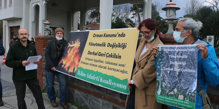 İklim Adaleti Koalisyonu, Orman Kanunu’nda yapılan yönetmelik değişikliğinin geri çekilmesini talep etmek için Sarıyer’de bulunan İstanbul Orman Bölge Müdürlüğü önünde basın açıklaması gerçekleştirdi. Açıklamada, “Orman Kanunu’nda yönetmelik değişikliği derhal geri çekilsin” pankartı taşındı. Açıklamayı İklim Adaleti Koalisyonu üyesi Levent Büyükbozkırlı okudu.
