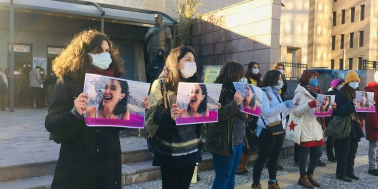 Muğla’da Metin Cemal Avcı tarafından öldürülen Pınar Gültekin için Kıbrıs Şehitleri Caddesinde 21 Temmuz 2020 tarihinde eylem yapan kadınlardan 12’si darp edilerek gözaltına alınmış, aynı günün gecesinde ifadeleri alındıktan sonra haklarında soruşturma açılarak serbest bırakılmıştı. 12 kadın hakkında “Görevi yaptırmamak için direnme”, “Kanuna aykırı gösteri” ve arbede esnasında polis tişörtü yırtıldığı için “Kamu malına zarar verme” suçlarından yargılanan kadınların ilk duruşması Bayraklı Adliyesi 47. Asliye Ceza Mahkemesinde görüldü. Duruşmaya taraf avukatları ile İnsan Hakları Derneği (İHD) Eş Genel Başkanı Avukat Eren Keskin ile avukatlar katıldı. Deniz Uslu, Emine Akbaba, Fatma Deniz Anur, Pınar Usta, Meryem Yıldırım, Arzu Sert, Gizem Coşkun, Elif Yerlikaya ve Berivan Oğuz’un hazır bulunduğu duruşma kimlik tespitiyle başladı.