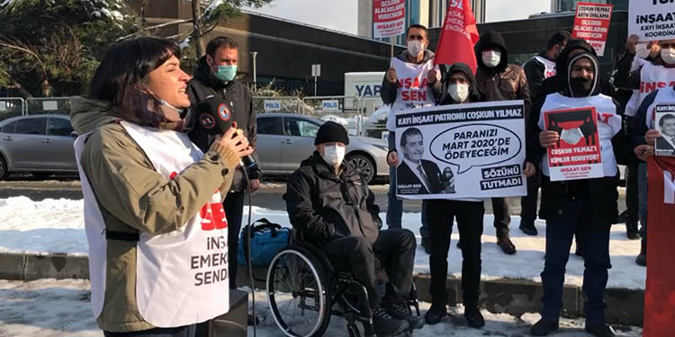 İnşaat Emekçileri Sendikası’na (İnşaat Sen) bağlı Kayı İnşaat İşçileri Koordinasyonu, ödenmeyen maaşları için başlattıkları eylem 6’ncı gününde devam ediyor. Haklarını almak üzere Levent’te bulunan işveren Çoşkun Yılmaz’ın ofisi önünde toplanan işçilere Halkların Demokratik Partisi (HDP) İstanbul Milletvekili Musa Piroğlu destek verdi. “Kayı inşaat patronu Coşkun Yılmaz işçilerin alacaklarını vereceksin” pankartının açıldığı açıklamada “Çoşkun Yılmaz artık oyalama, işçilerin haklarını vereceksin” dövizleri taşındı. Sık sık “Zafer direnen emekçinin olacak”, “İşçiler burada patron Yılmaz nerede” ve “İşçilerin birliği patronları yenecek” sloganları atıldı.