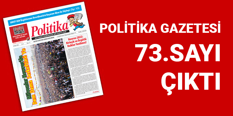 “Birleşik ve Örgütlü Halklar Yenilmez” başlıklı başyazısıyla, Kürt halkının newroz coşkusunu selamlayan Politika Gazetesi, 2022 Newroz’uyla, belediyelere kayyum atayan, siyasal temsilci, yönetici ve önderlerini tutsak ederek “bitti, bitecek, köklerini kazıdık” diyenlere mesaj verildiğinin altı çiziyor. Başyazıda, 2022 Newroz’unun aynı zamanda “sınıf savaşımını hafife alan, seçim ittifakları tartışmalarına odaklanan sınıftan ve kitlelerden kopuk ‘sol’ gruplar için de bir mesaj olmuştur”, deniliyor.