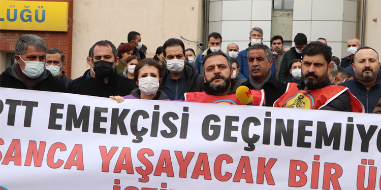 Basın, Yayın, İletişim ve Posta Emekçileri Sendikası (HABER-SEN) Diyarbakır Şubesi üyeleri, Posta İşletmesi Genel Müdürlüğü çalışanlarının koşulları ve ücret taleplerine ilişkin Diyarbakır PTT Müdürlüğü binası bahçesinde açıklama yaptı. Çok sayıda kişinin katıldığı açıklamada, “PTT emekçileri geçinemiyor. İnsanca yaşayacak bir ücret istiyoruz” yazılı pankart açıldı.