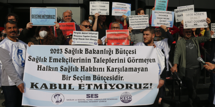 Sağlık ve Sosyal Hizmet Emekçileri Sendikası (SES) İstanbul Aksaray Şubesi, Meclis’te görüşülen 2023 yılı bütçesine ilişkin Samatya Eğitim ve Araştırma Hastanesi önünde basın açıklaması yaptı. Çok sayıda sağlık emekçisini katıldığı basın açıklamasında, “2023 Sağlık Bakanlığı Bütçesi, sağlık emekçilerinin taleplerini görmeyen halkın sağlık hakkını karşılamayan bir seçim bütçesidir. Kabul etmiyoruz” pankartı açılarak, “Geçinemiyoruz”, “Sağlık çalışanlarına ücretsiz ulaşım istiyoruz”, “Vergide adalet istiyoruz. Maaşlara yapılan zamlar vergi olarak geri alınıyor”, “Vergi yükü kaldırılsın”, “Sefalete teslim olmayacağız”, “Kreş ve sağlık imkanı sağlansın”, “Geçinemiyoruz insanca yaşanacak ücret istiyoruz” dövizleri taşındı.