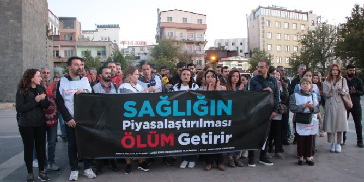 Amed Sağlık Platformu, Amed Emek ve Demokrasi Platformu ve Dicle Amed Kadın Platformu “Sağlığın piyasalaştırılması ölüm getirir” sloganıyla Şêx Saîd (Dağkapı) Meydanı’nda basın açıklaması gerçekleştirdi. Açıklamada sık sık “AKP sağlığa zararlıdır” sloganları atılırken “Sağlığın piyasalaştırılması ölüm getirir” pankartı açıldı.