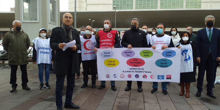 Adana’da sağlık emekçileri, 8 Şubat’ta yapacakları bir günlük iş bırakma eylemine ilişkin Seyhan Devlet Hastanesi önünde basın açıklaması yaptı. Açıklamayı, Adana Tabip Odası (ATO) Başkanı Selahattin Menteş yaptı.
