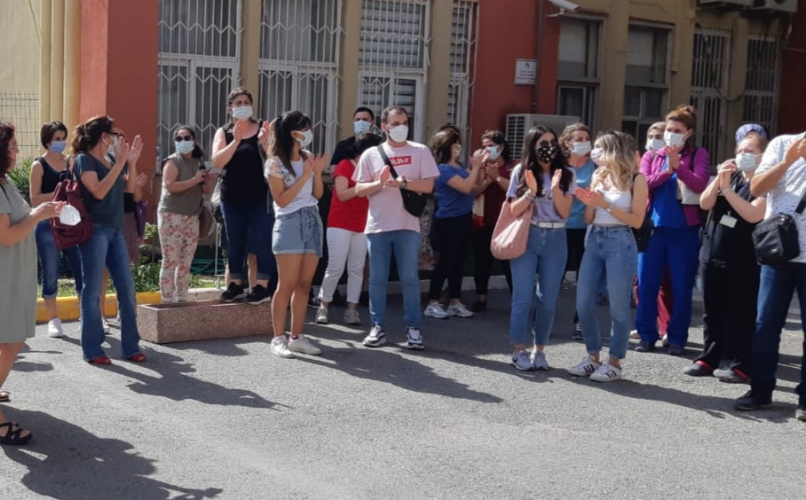 İzmir Katip Çelebi Üniversitesi Atatürk Eğitim ve Araştırma Hastanesi çalışanları, AKP’li Cumhurbaşkanı Tayyip Erdoğan’ın kararıyla Ramazan Bayramı’nda 2,5 gün idari izinli sayıldıkları dönemde, ücretlerinden kesinti yapılmasını protesto etti. Hastane önünde bir araya gelen sağlık emekçileri adına konuşan Sosyal Hizmet Emekçileri Sendikası (SES) İzmir Şube yöneticisi Hülya Baran Ulaşoğlu, Erdoğan’ın “hak kaybı olmayacak” sözlerine rağmen Sağlık Bakanlığı’nın ödemeleri eksik yaptığını belirtti.