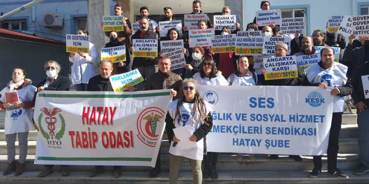 Hatay’da iş bırakan sağlık emekçileri, ikinci günde de alanlarda olup, taleplerini haykırdı. Hatay Tabip Odası ve SES Hatay Şubesi, Samandağ Devlet Hastanesi, MKÜ ve İskenderun Devlet Hastanesi önünde açıklamalar yaparak, “Oyalama değil, hakkımızı istiyoruz” dedi.