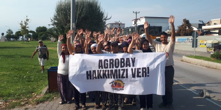 İzmir Bergama ilçesinde bulunan Agrobay Seracılık’ta çalışan 39 işçi, Tarım İşçileri Sendikası’na üye oldukları gerekçesiyle 23 Ağustos’ta işten çıkarıldı. İşçiler işten çıkarılmalarına karşı 10 gündür sera önünde yaptıkları eylemlerle haklarının verilmesini istiyor. Bugünde sera önünde bir araya gelen işçiler, “Agrobay hakkımızı ver” pankartı açarak, “Direne direne direnişle zafere”, “İşçiyiz haklıyız kazacanacağız” “Direne direne kazanacağız” “Agrobay şaşırma, sabrımızı taşırma sloganları atıldı.