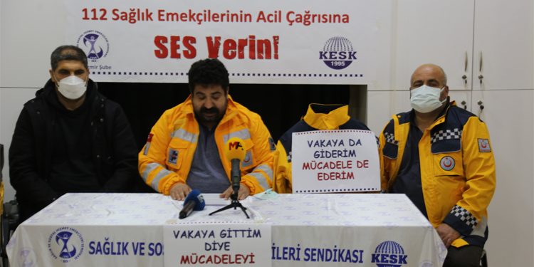 Sağlık ve Sosyal Hizmet Emekçileri Sendikası (SES) İzmir Şubesi, 112 Acil Sağlık Servisi çalışanlarının sorunlarına ilişkin sendika binalarında basın toplantısı düzenledi. Salonda, “Alo 112 sesimizi duyan var mı? 112 sağlık emekçilerinin acil çağrısına ses verin” pankartının asıldı. Açıklamayı yapan SES İzmir Şubesi Eşbaşkanı Erkan Batmaz, 112 ekiplerinin vakaya çıkarken tamamen bir bilinmezliğe gittiğini söyledi.