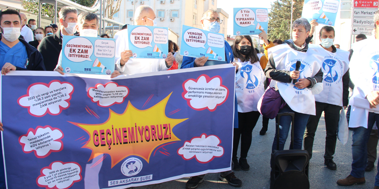 Sağlık ve Sosyal Hizmet Emekçileri Sendikası (SES) İstanbul Aksaray Şubesi, artan zamlar ve ekonomideki kötü gidişata ilişkin Fatih’te bulunan Cerrahpaşa Tıp Fakültesi Acil Servisi önünde açıklama yaptı. “Geçinemiyoruz” pankartının açıldığı açıklamada “Sefalete teslim olmayacağız” sloganı atıldı. SES üyesi Aydın Erol, “Hekim dışı personel ve üniversite hastaneleri kapsam dışı bırakılıyor. Sağlık bakanlığı, bakanlığa bağlı hekimlerin sağlık hizmetine katkısına bakılmadan sabit ödemelerinde artış yaptı. Ama hekimlerin birçoğu tavana yakın performans almaktalar. Aldıkları bu performanstan sabit ödemeler mahsup edildiğinde söylendiği gibi 2 bin 500-5 bin lira maaş zammı olmayacak” dedi.