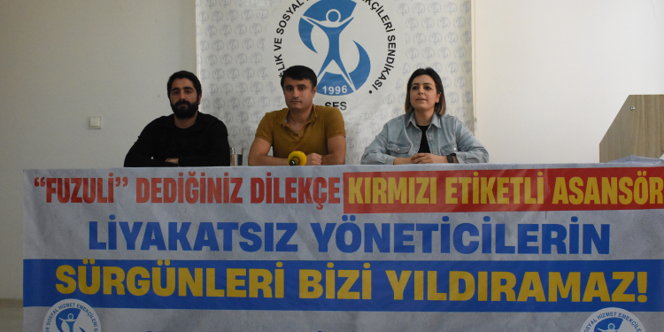 Sürgün kararına ilişkin SES Yenîşehir ilçesinde bulunan sendika binasına açıklama yapıldı. Açıklamanın yapıldığı salona “Fuzuli dediğiniz dilekçe kırmızı etiketli asansör”, “Liyakatsiz yöneticilerin sürgünleri bizi yıldıramaz” yazılı pankart asıldı. Açıklamayı SES Amed Şubesi Eşbaşkanı Mehmet Nur Ulus yaptı.