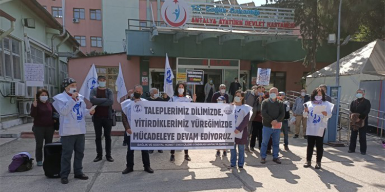 Sağlık ve Sosyal Hizmet Emekçileri Sendikası (SES) Antalya Şubesi, koronavirüs (Kovid-19) pandemisinin birinci yılı nedeniyle Antalya Atatürk Devlet Hastanesi önünde basın açıklaması gerçekleştirdi. SES Antalya Şube Eşbaşkanı Dr. Kaan Taşer, pandeminin başından beri taleplerini dile getirdiklerini ancak hükümetin taleplerine kulak vermediğini söyledi.