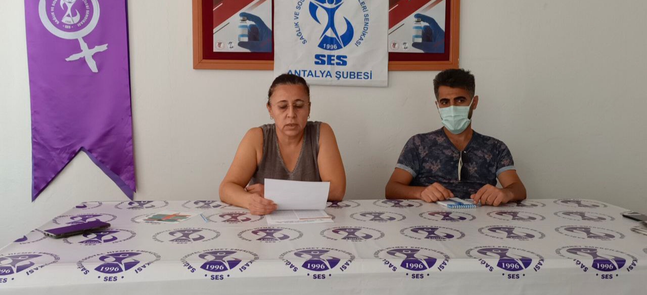 Sağlık ve Sosyal Hizmet Emekçileri Sendikası (SES) Antalya Şubesi, koronavirüs salgını ve aşılamaya dair sendika binasında açıklama yaptı. SES Antalya Şubesi Eşbaşkanı Şükran İçöz, koronavirüs vakalarında ciddi artışlar yaşandığını ve yeni bir pikle karşı karşıya oldukları uyarısında bulundu. İçöz, “Turizm sezonu düşünülerek, aşılama düzeyinin çok düşük olduğu bir dönemde tam açılmaya gidildi. Vaka sayıları 4 binli rakamlara gerilemişken, son günlerde yine 25 binli rakamlara yükseldi. Hayatını kaybeden vatandaşlarımızı da artık yüzlü rakamlarla ifade ediyoruz. Aşılama oranının çok düşük illerde yoğun bakımların neredeyse tamamı dolu” ifadelerini kullandı.