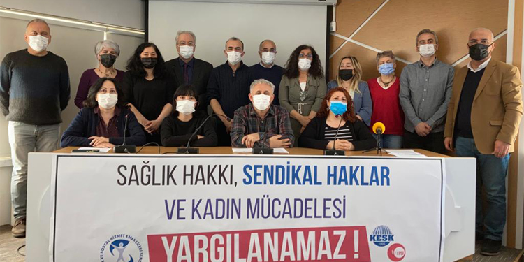 Kamu Emekçileri Sendikası Konfederasyonu (KESK), Türk Tabipler Birliği (TTB), Ankara Tabip Odası (ATO), Eğitim ve Bilim Emekçileri Sendikası (Eğitim Sen) ve Tüm Belediye ve Yerel Yönetim Hizmetleri Emekçileri Sendikası (TÜM BEL-SEN) yöneticilerinin katıldığı basın toplantısında, “Sağlık hakkı, sendikal haklar ve kadın mücadelesi yargılanamaz!” yazılı pankart açıldı.