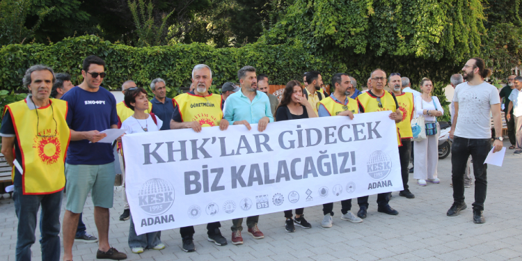 Kamu Emekçileri Sendikaları Konfederasyonu (KESK) Adana Şubeler Platformu, Kanun Hükmünde Kararnamelerle (KHK) işten çıkarılan KESK üyelerinin işlerine iade edilmesi talebiyle bu haftada da Heykelli Park’ta açıklama yaptı. Açıklamaya çok sayıda kişi katılırken, basın metnini KESK Adana Şubeler Platformu adına Dr. Mürşit Enis Akyüz okudu.