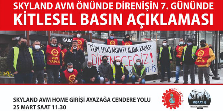 Perşembe günü saat 11:30’da Skyland AVM önünde düzenlenecek olan basın açıklamasına çağrı yapan Dev Yapı İş ve İnşaat İş sendikaları, emekten yana olan herkesi yanlarında olmaya çağırdı.