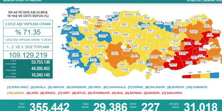 Sağlık Bakanlığı’nın günlük açıkladığı koronavirüs verilere göre son 24 saatte 355 bin 442 test yapıldı ve 29 bin 386 yeni vaka tespit edildi. 227 kişinin koronavirüs sebebiyle hayatını kaybettiği belirtildi.
